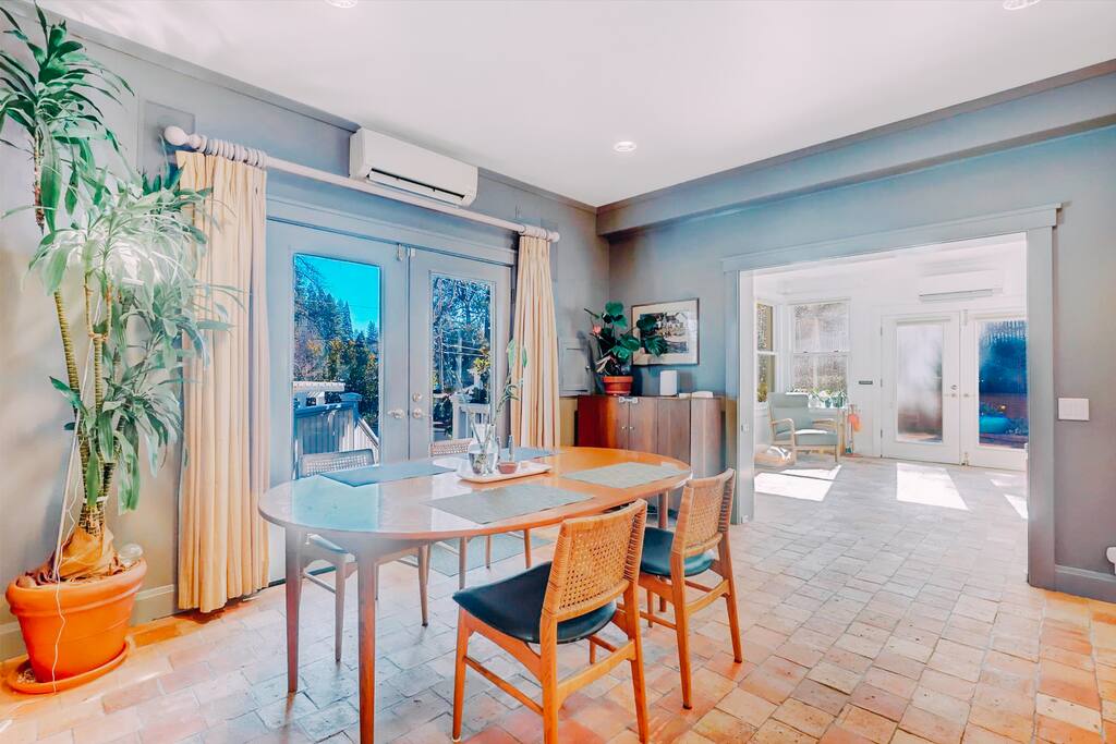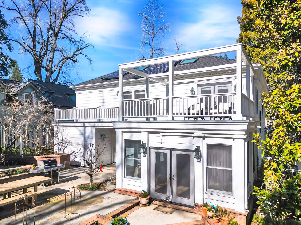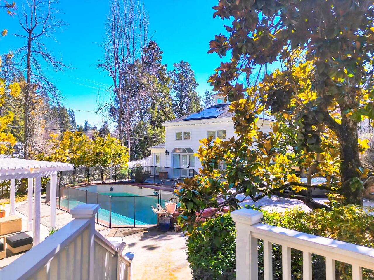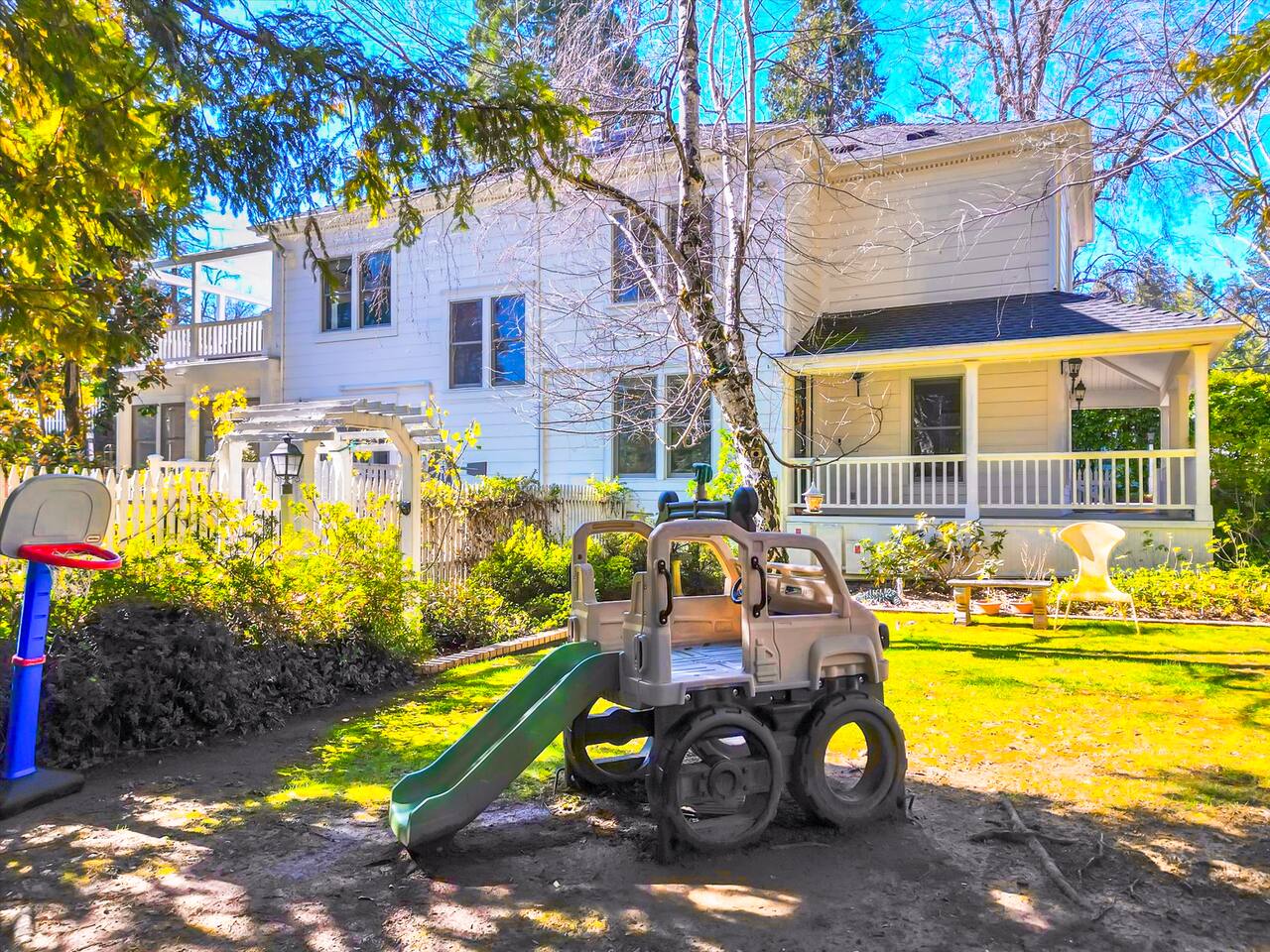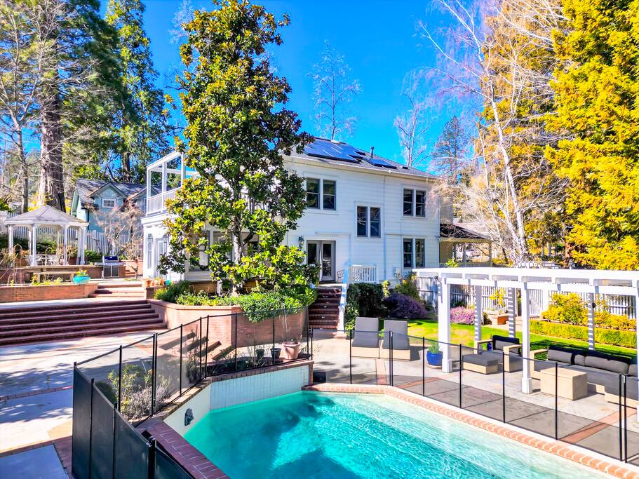 Discover your spacious 2,600 sq ft Victorian retreat, lovingly remodeled and nestled in the heart of Nevada City off Broad street! Built in the 1800s, this home offers historic charm with modern comfort, creating a memorable getaway. Wake up with a cup of coffee on the wraparound porch. Spend your afternoons lounging by the pool or strolling downtown — just a 5-minute walk away. Ideal for families or retreats, spacious and accommodating for all. This Victorian home offers a unique blend of comfort, luxury, and convenience, making it the perfect base for your Nevada City adventure. Pet-friendly, with conditions: Well-behaved dogs are welcome. Please inquire about your furry friends before booking. Amenities: •Pool/Hot tub •Black out shades in all bedrooms. •Electric Fireplace •Peloton Bike/Workout equipment •BBQ •Outdoor kids play equipment •Smart TVs •Private Upstairs Patio •Spacious, private yard •Kids room/toys/pack and play, optional baby gate and basic children's utensils •Walkable to historic downtown shops & restaurants •Spacious front parking area with room for multiple cars, plus free street parking •Laundry room with washer and dryer, accessible through the back entry to garage. •High-speed internet. •Mini-split heating and air conditioning throughout the home, with individual room controls. •Tesla Charger •Solar and Backup Batteries Bedrooms: Master Suite: Indulge in the vaulted beam master bedroom, a true sanctuary featuring a private outdoor patio, a large-screen smart TV, and an opulent en-suite bathroom. The bathroom boasts floor-to-wall marble tiles, full-length mirrors, a large standing shower, and heated towel racks. For your wellness, enjoy a Peloton bike, a rebounding trampoline, Pilates mat/blocks, and a mini-fridge for chilled water. Guest Bedrooms: Two additional bedrooms offer comfortable accommodations. One bedroom features two queen beds and a smart TV. The other serves as a versatile office/bedroom with a sleeper day bed stacked double mattress sleeps twin. Or, remove the top to side-by-side on the floor for an oversized queen and linens stored in the cabinets. All bedrooms are equipped with blackout shades for a restful night’s sleep. Bathrooms: The home features 2.5 bathrooms, with the master en-suite being a luxurious highlight. Living Spaces: Downstairs Entertainment: The downstairs area is designed for entertaining, featuring a deluxe full kitchen with a large range, double oven, and ample cooking supplies. The spacious dining area flows seamlessly into a sunroom filled with toys for children. The living room is a cozy haven with an oversized modular leather sofa, a beanbag, a large smart TV, a fireplace, and a selection of books and reading materials. Kitchen: The gourmet kitchen is fully equipped with everything you need to prepare delicious meals, featuring modern appliances and plenty of counter space. Outdoor Spaces: A sprawling outdoor oasis awaits you—a rare find in downtown Nevada City. Relax by the private pool and hot tub, where a safety gate ensures child protection. Enjoy alfresco dining under the pergola, with a BBQ grill and spacious dining table. Two fenced yards provide safe play areas for dogs and children, while the front yard boasts robust play equipment. Majestic, mature redwoods create a serene, secluded atmosphere.