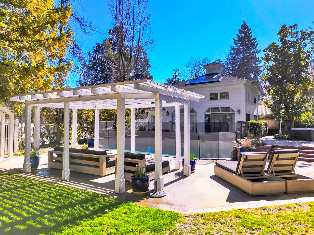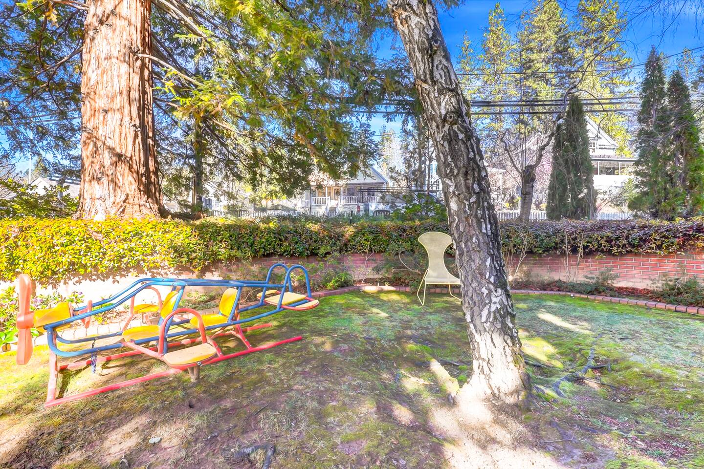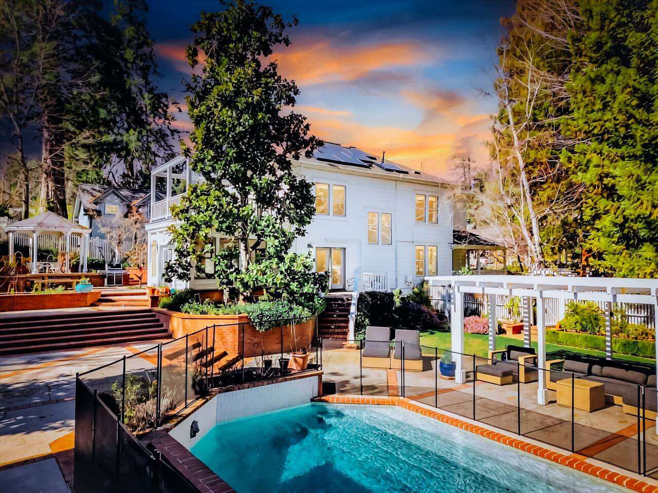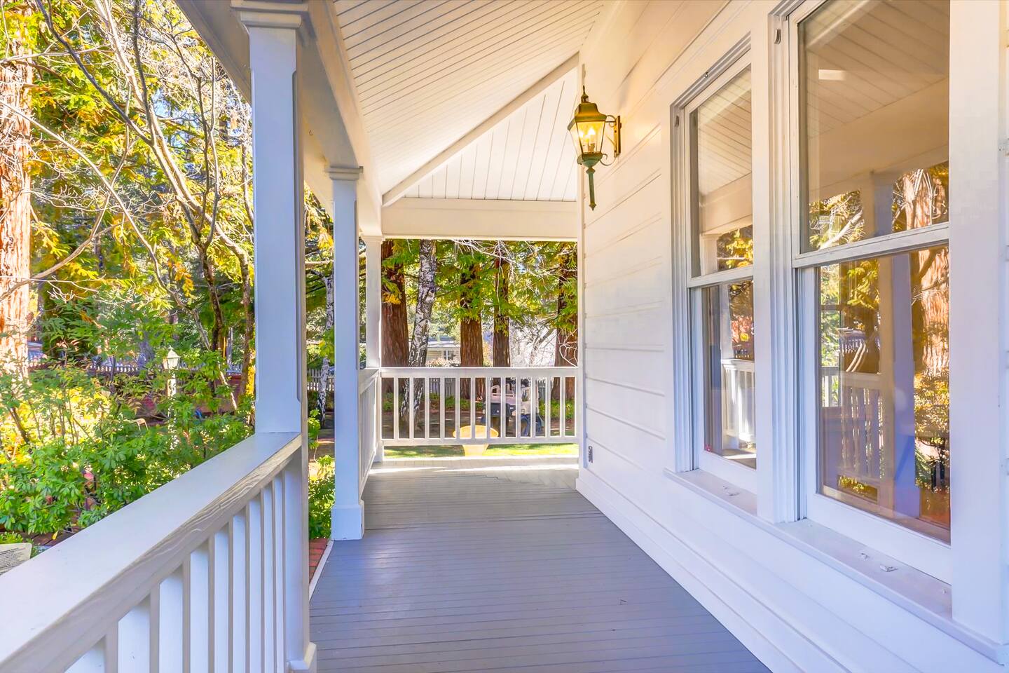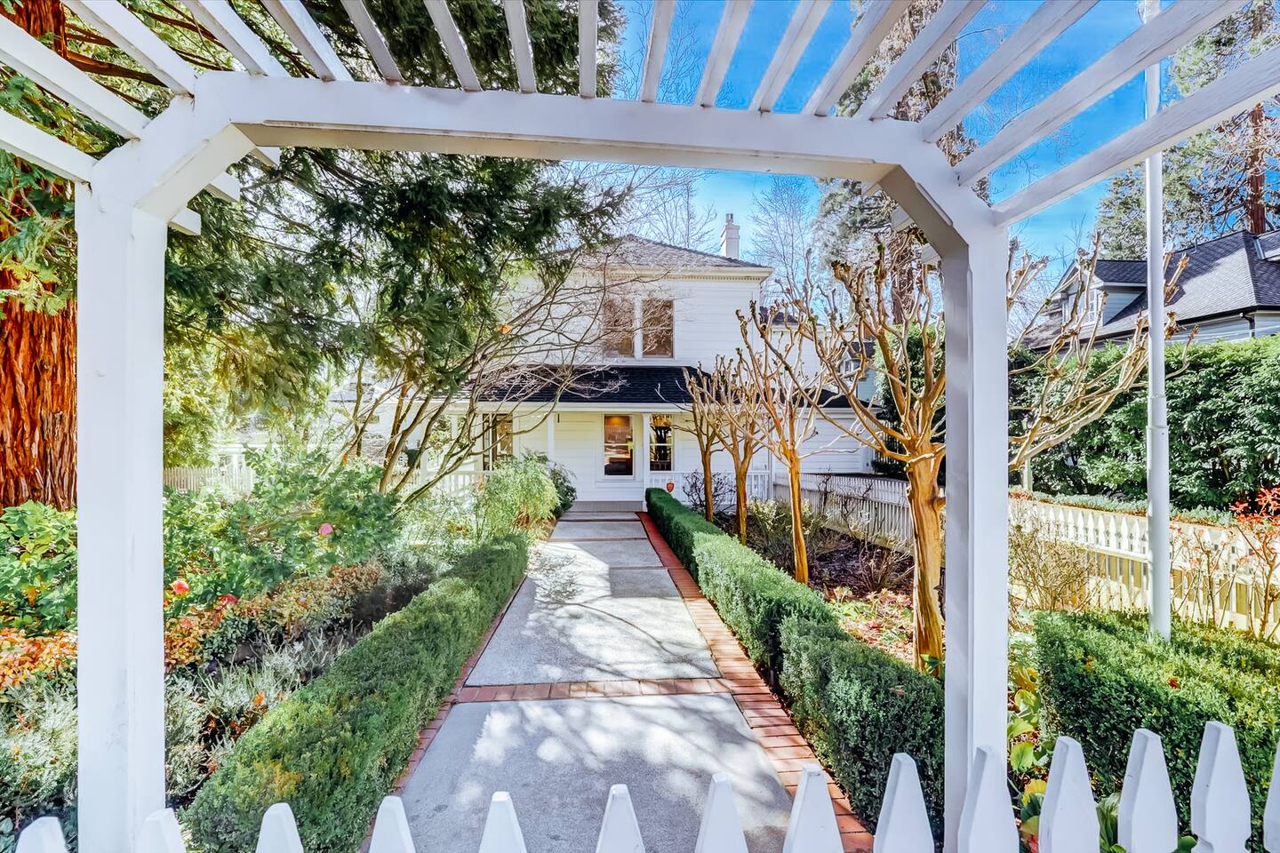 Discover your spacious 2,600 sq ft Victorian retreat, lovingly remodeled and nestled in the heart of Nevada City off Broad street! Built in the 1800s, this home offers historic charm with modern comfort, creating a memorable getaway. Wake up with a cup of coffee on the wraparound porch. Spend your afternoons lounging by the pool or strolling downtown — just a 5-minute walk away. Ideal for families or retreats, spacious and accommodating for all. This Victorian home offers a unique blend of comfort, luxury, and convenience, making it the perfect base for your Nevada City adventure. Pet-friendly, with conditions: Well-behaved dogs are welcome. Please inquire about your furry friends before booking. Amenities: •Pool/Hot tub •Black out shades in all bedrooms. •Electric Fireplace •Peloton Bike/Workout equipment •BBQ •Outdoor kids play equipment •Smart TVs •Private Upstairs Patio •Spacious, private yard •Kids room/toys/pack and play, optional baby gate and basic children's utensils •Walkable to historic downtown shops & restaurants •Spacious front parking area with room for multiple cars, plus free street parking •Laundry room with washer and dryer, accessible through the back entry to garage. •High-speed internet. •Mini-split heating and air conditioning throughout the home, with individual room controls. •Tesla Charger •Solar and Backup Batteries Bedrooms: Master Suite: Indulge in the vaulted beam master bedroom, a true sanctuary featuring a private outdoor patio, a large-screen smart TV, and an opulent en-suite bathroom. The bathroom boasts floor-to-wall marble tiles, full-length mirrors, a large standing shower, and heated towel racks. For your wellness, enjoy a Peloton bike, a rebounding trampoline, Pilates mat/blocks, and a mini-fridge for chilled water. Guest Bedrooms: Two additional bedrooms offer comfortable accommodations. One bedroom features two queen beds and a smart TV. The other serves as a versatile office/bedroom with a sleeper day bed stacked double mattress sleeps twin. Or, remove the top to side-by-side on the floor for an oversized queen and linens stored in the cabinets. All bedrooms are equipped with blackout shades for a restful night’s sleep. Bathrooms: The home features 2.5 bathrooms, with the master en-suite being a luxurious highlight. Living Spaces: Downstairs Entertainment: The downstairs area is designed for entertaining, featuring a deluxe full kitchen with a large range, double oven, and ample cooking supplies. The spacious dining area flows seamlessly into a sunroom filled with toys for children. The living room is a cozy haven with an oversized modular leather sofa, a beanbag, a large smart TV, a fireplace, and a selection of books and reading materials. Kitchen: The gourmet kitchen is fully equipped with everything you need to prepare delicious meals, featuring modern appliances and plenty of counter space. Outdoor Spaces: A sprawling outdoor oasis awaits you—a rare find in downtown Nevada City. Relax by the private pool and hot tub, where a safety gate ensures child protection. Enjoy alfresco dining under the pergola, with a BBQ grill and spacious dining table. Two fenced yards provide safe play areas for dogs and children, while the front yard boasts robust play equipment. Majestic, mature redwoods create a serene, secluded atmosphere.