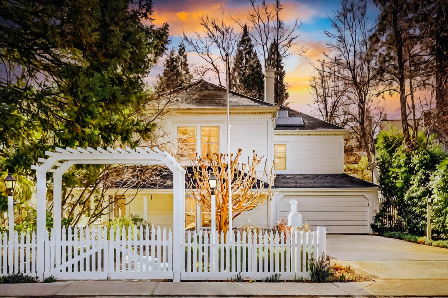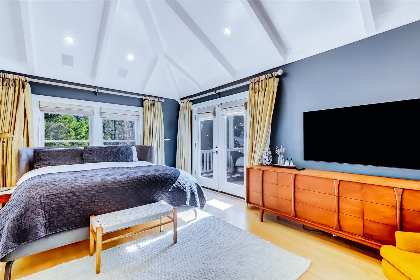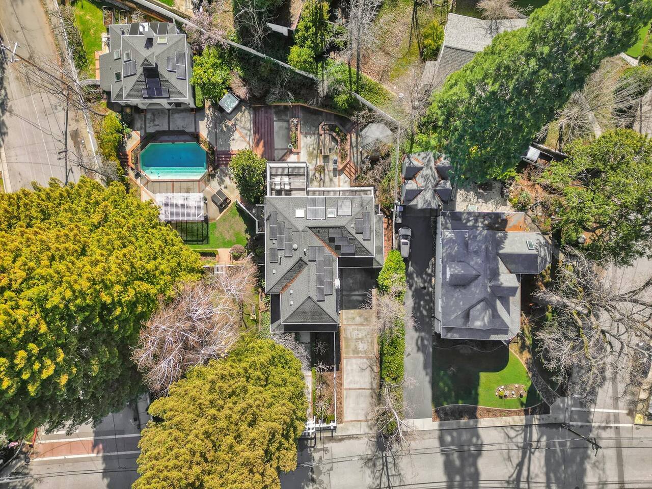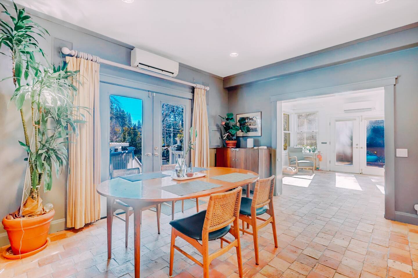 Discover your spacious 2,600 sq ft Victorian retreat, lovingly remodeled and nestled in the heart of Nevada City off Broad street! Built in the 1800s, this home offers historic charm with modern comfort, creating a memorable getaway. Wake up with a cup of coffee on the wraparound porch. Spend your afternoons lounging by the pool or strolling downtown — just a 5-minute walk away. Ideal for families or retreats, spacious and accommodating for all. This Victorian home offers a unique blend of comfort, luxury, and convenience, making it the perfect base for your Nevada City adventure. Pet-friendly, with conditions: Well-behaved dogs are welcome. Please inquire about your furry friends before booking. Amenities: •Pool/Hot tub •Black out shades in all bedrooms. •Electric Fireplace •Peloton Bike/Workout equipment •BBQ •Outdoor kids play equipment •Smart TVs •Private Upstairs Patio •Spacious, private yard •Kids room/toys/pack and play, optional baby gate and basic children's utensils •Walkable to historic downtown shops & restaurants •Spacious front parking area with room for multiple cars, plus free street parking •Laundry room with washer and dryer, accessible through the back entry to garage. •High-speed internet. •Mini-split heating and air conditioning throughout the home, with individual room controls. •Tesla Charger •Solar and Backup Batteries Bedrooms: Master Suite: Indulge in the vaulted beam master bedroom, a true sanctuary featuring a private outdoor patio, a large-screen smart TV, and an opulent en-suite bathroom. The bathroom boasts floor-to-wall marble tiles, full-length mirrors, a large standing shower, and heated towel racks. For your wellness, enjoy a Peloton bike, a rebounding trampoline, Pilates mat/blocks, and a mini-fridge for chilled water. Guest Bedrooms: Two additional bedrooms offer comfortable accommodations. One bedroom features two queen beds and a smart TV. The other serves as a versatile office/bedroom with a sleeper day bed stacked double mattress sleeps twin. Or, remove the top to side-by-side on the floor for an oversized queen and linens stored in the cabinets. All bedrooms are equipped with blackout shades for a restful night’s sleep. Bathrooms: The home features 2.5 bathrooms, with the master en-suite being a luxurious highlight. Living Spaces: Downstairs Entertainment: The downstairs area is designed for entertaining, featuring a deluxe full kitchen with a large range, double oven, and ample cooking supplies. The spacious dining area flows seamlessly into a sunroom filled with toys for children. The living room is a cozy haven with an oversized modular leather sofa, a beanbag, a large smart TV, a fireplace, and a selection of books and reading materials. Kitchen: The gourmet kitchen is fully equipped with everything you need to prepare delicious meals, featuring modern appliances and plenty of counter space. Outdoor Spaces: A sprawling outdoor oasis awaits you—a rare find in downtown Nevada City. Relax by the private pool and hot tub, where a safety gate ensures child protection. Enjoy alfresco dining under the pergola, with a BBQ grill and spacious dining table. Two fenced yards provide safe play areas for dogs and children, while the front yard boasts robust play equipment. Majestic, mature redwoods create a serene, secluded atmosphere.