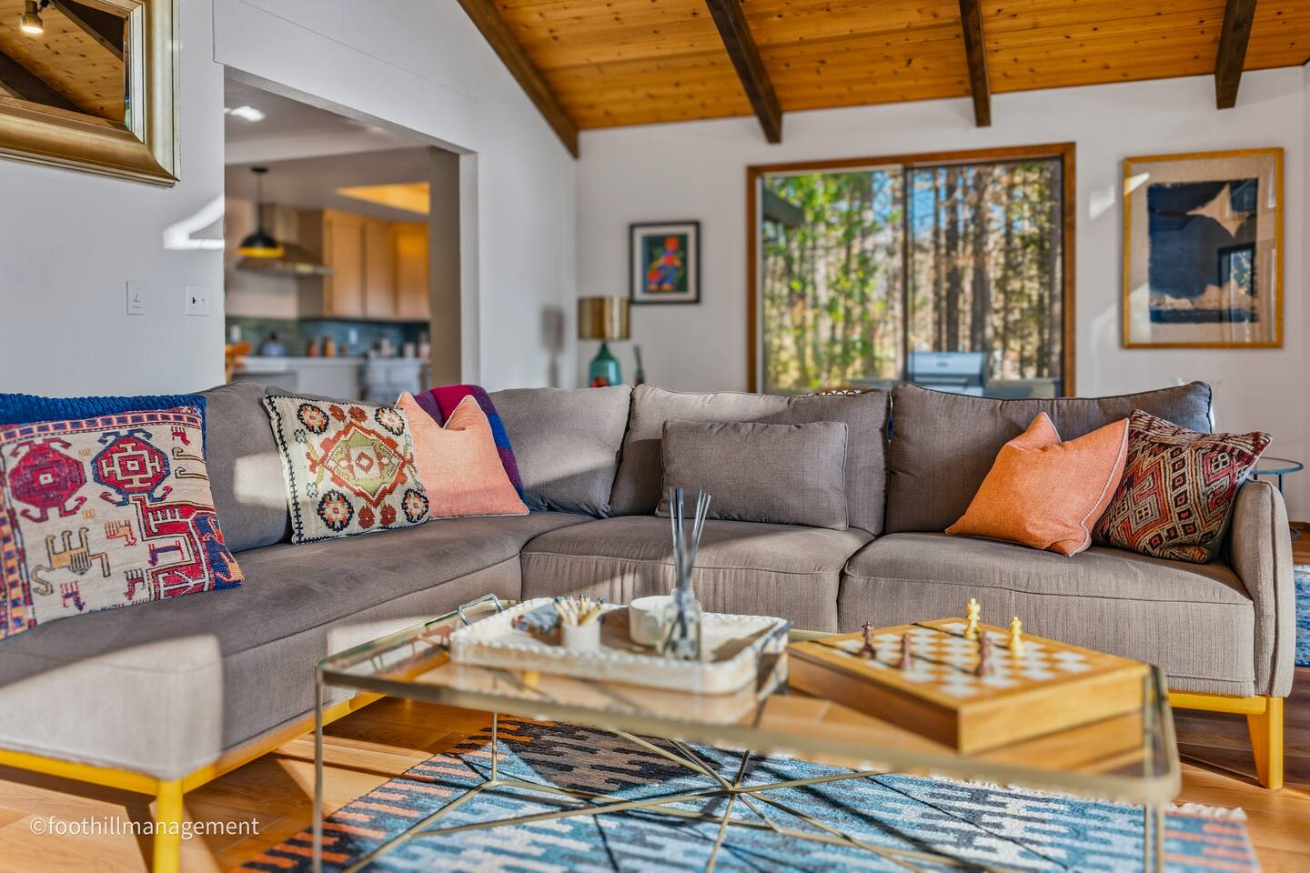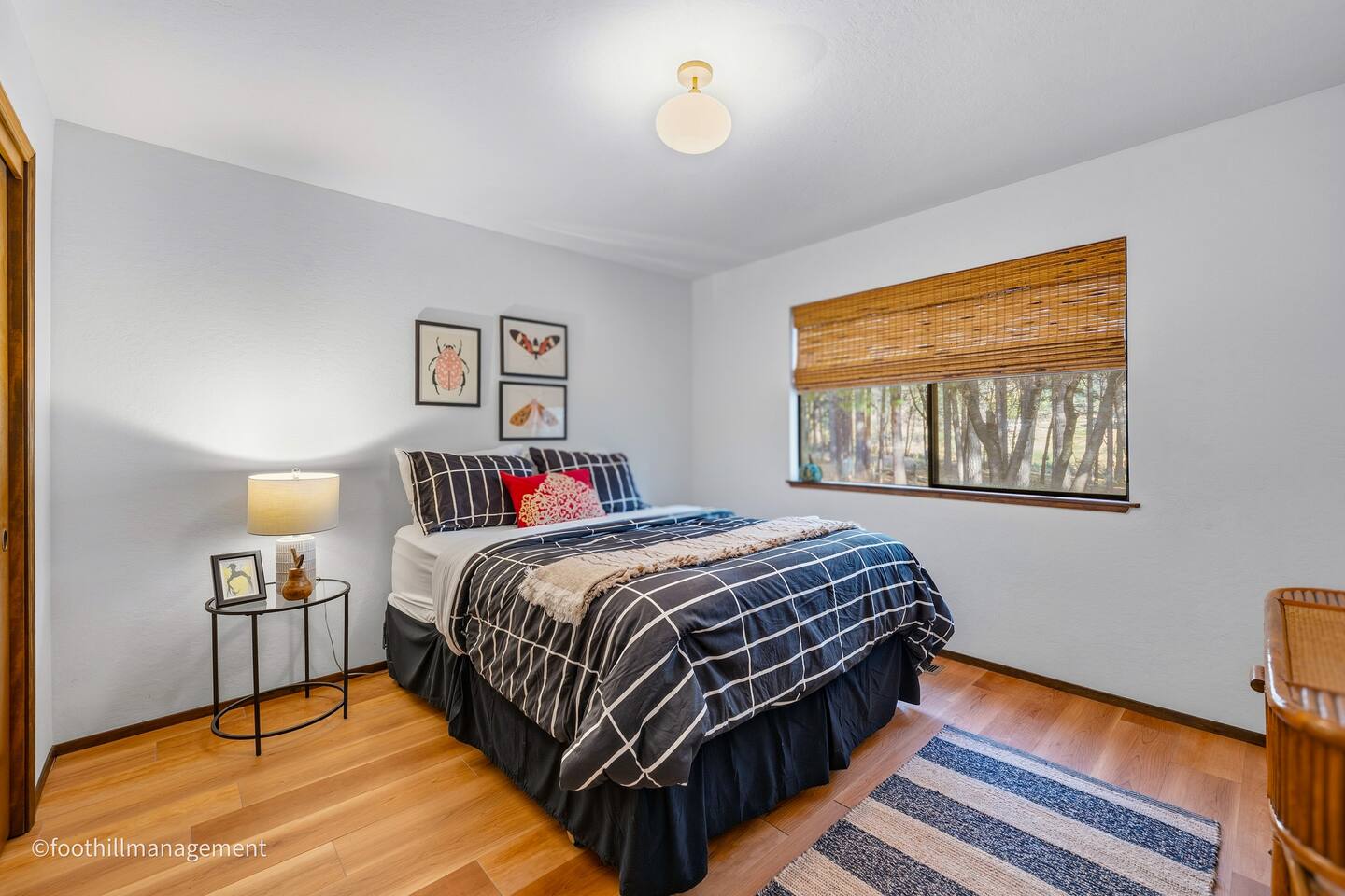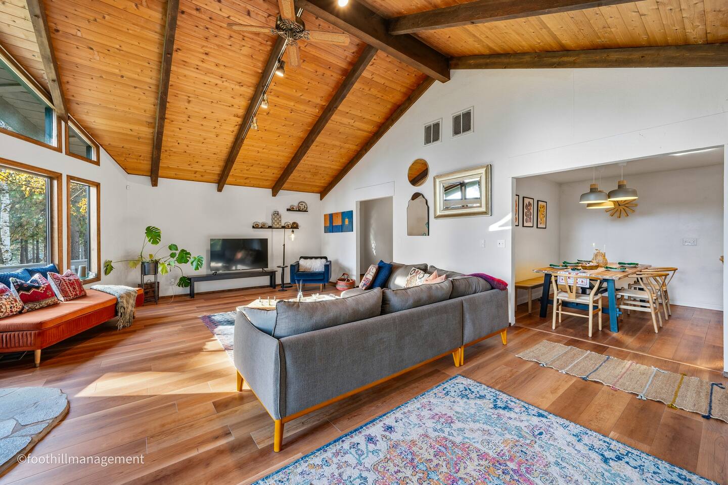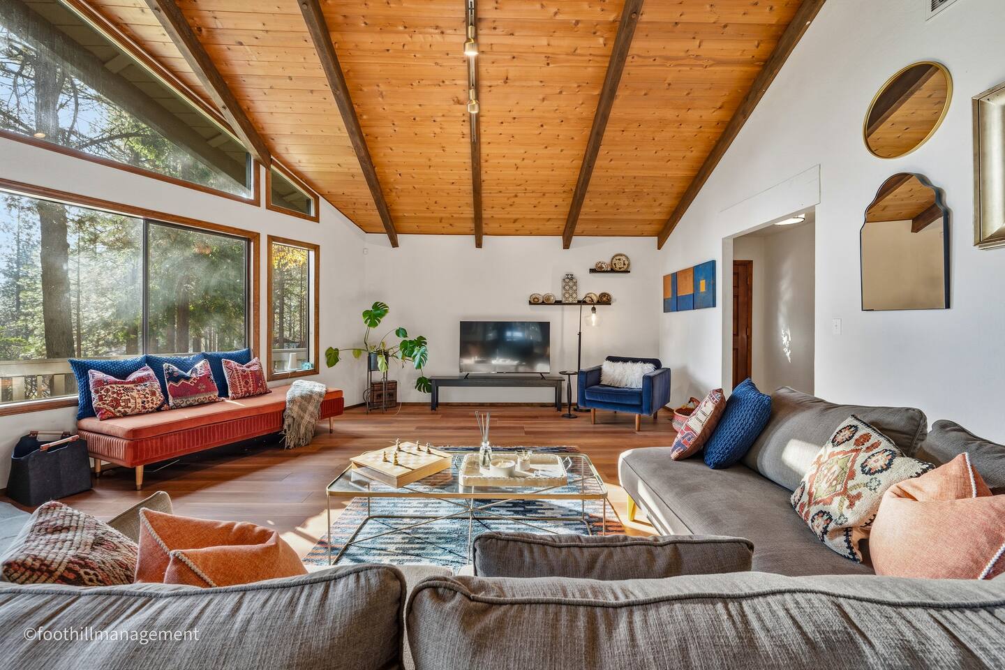 Stylish and serene, this vaulted-ceiling retreat offers a fully stocked home with a romantic wood-burning fireplace, a large cozy couch, an oversized dining area with extra seating, and a beautifully updated kitchen perfect for hosting family gatherings. The home includes two full bathrooms (one ensuite in the master), three comfortable bedrooms, plus a fun bunk room with three trundle beds in the bonus/game room. Step outside to enjoy two deluxe BBQs, an expansive patio with a horseshoe pit and basketball hoop, and a large 6–8 person hot tub. Inside, you’ll find two large Smart TVs, fast streaming Wi-Fi, and plenty of games to keep the kids entertained. With lots of room to stretch out yet still spend meaningful time together, this home strikes the perfect balance of cozy and spacious. Surrounded by mature pines and just a quick drive to Grass Valley and Nevada City, you’ll be close to the action but private enough to truly relax.