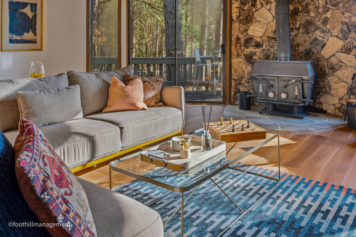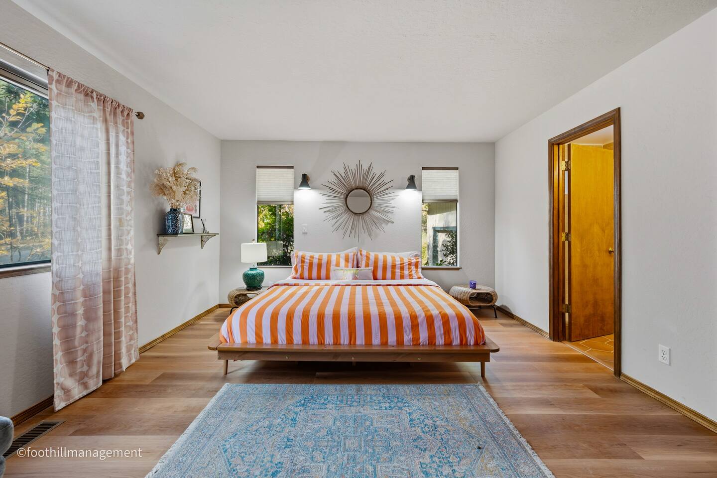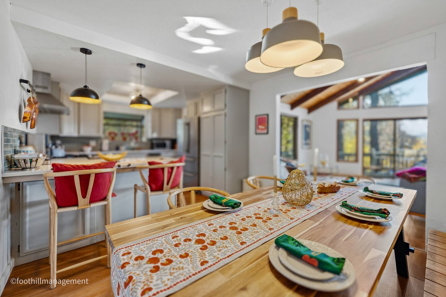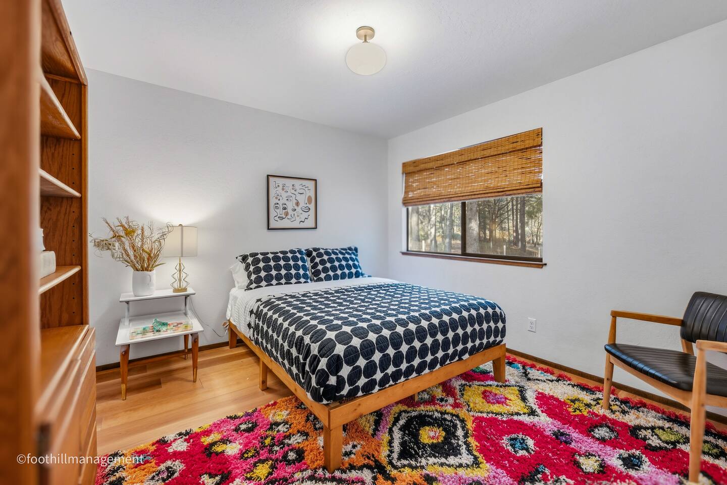 Stylish and serene, this vaulted-ceiling retreat offers a fully stocked home with a romantic wood-burning fireplace, a large cozy couch, an oversized dining area with extra seating, and a beautifully updated kitchen perfect for hosting family gatherings. The home includes two full bathrooms (one ensuite in the master), three comfortable bedrooms, plus a fun bunk room with three trundle beds in the bonus/game room. Step outside to enjoy two deluxe BBQs, an expansive patio with a horseshoe pit and basketball hoop, and a large 6–8 person hot tub. Inside, you’ll find two large Smart TVs, fast streaming Wi-Fi, and plenty of games to keep the kids entertained. With lots of room to stretch out yet still spend meaningful time together, this home strikes the perfect balance of cozy and spacious. Surrounded by mature pines and just a quick drive to Grass Valley and Nevada City, you’ll be close to the action but private enough to truly relax.